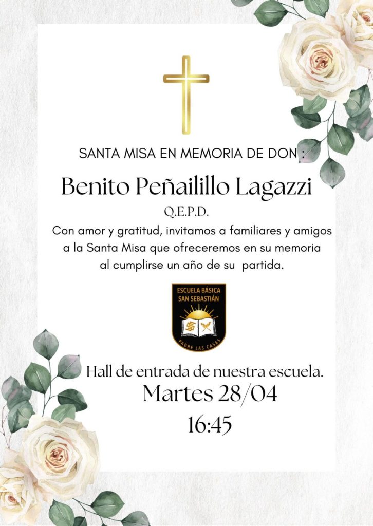 PADRE LAS CASAS, 27/04/2026 – La comunidad educativa de la Escuela Básica San Sebastián de Padre Las Casas desea extender una cordial y sentida invitación a toda la comunidad, familiares y amigos, para unirse en una Santa Misa conmemorativa al cumplirse un año del fallecimiento del querido Don Benito Peñailillo Lagazzi.